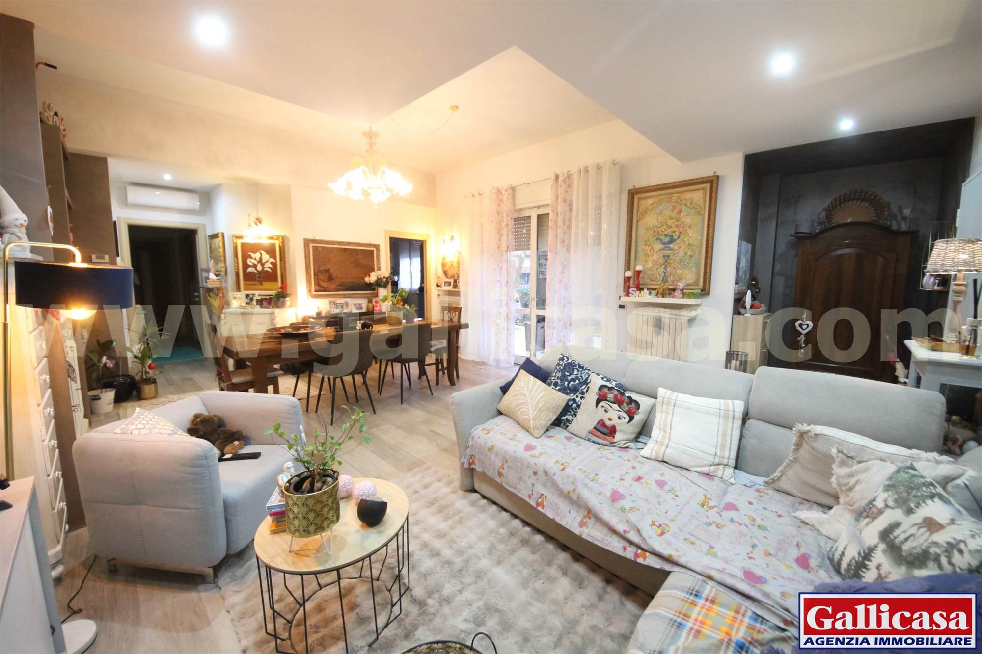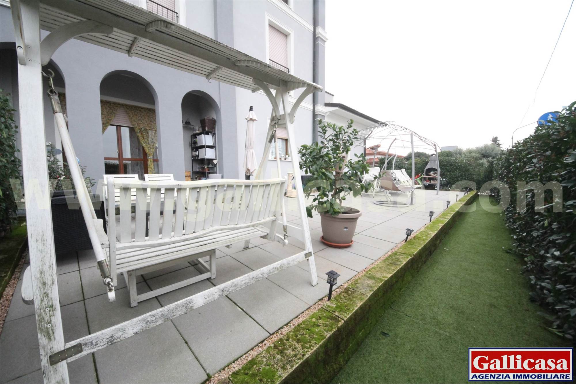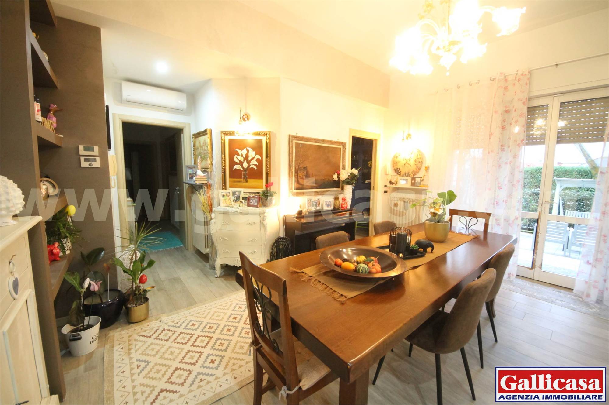 L’ingresso si apre su un ampio e luminoso soggiorno con accesso diretto alla loggia coperta e all’ampio giardino privato, ideale per momenti di relax e convivialità.